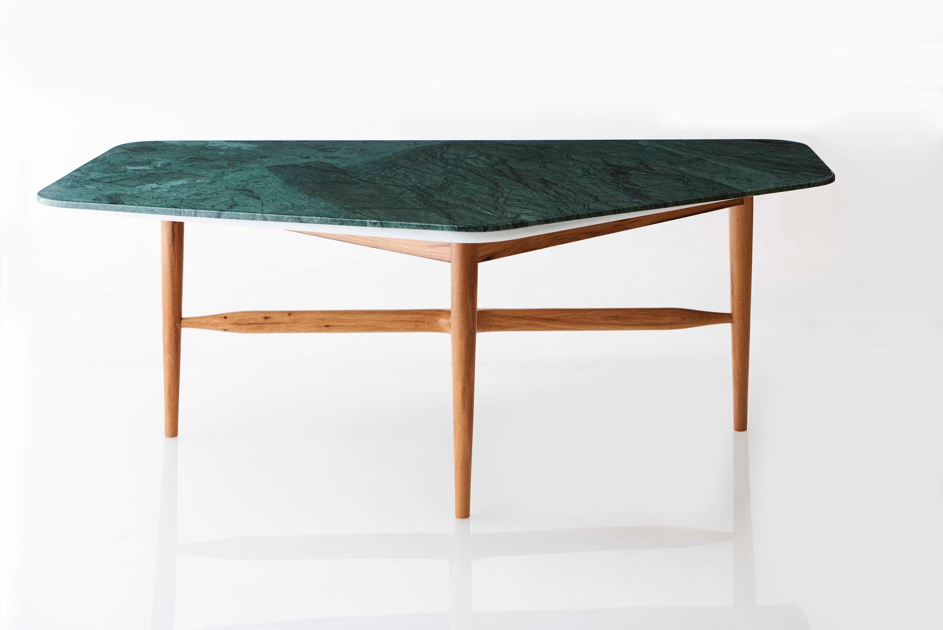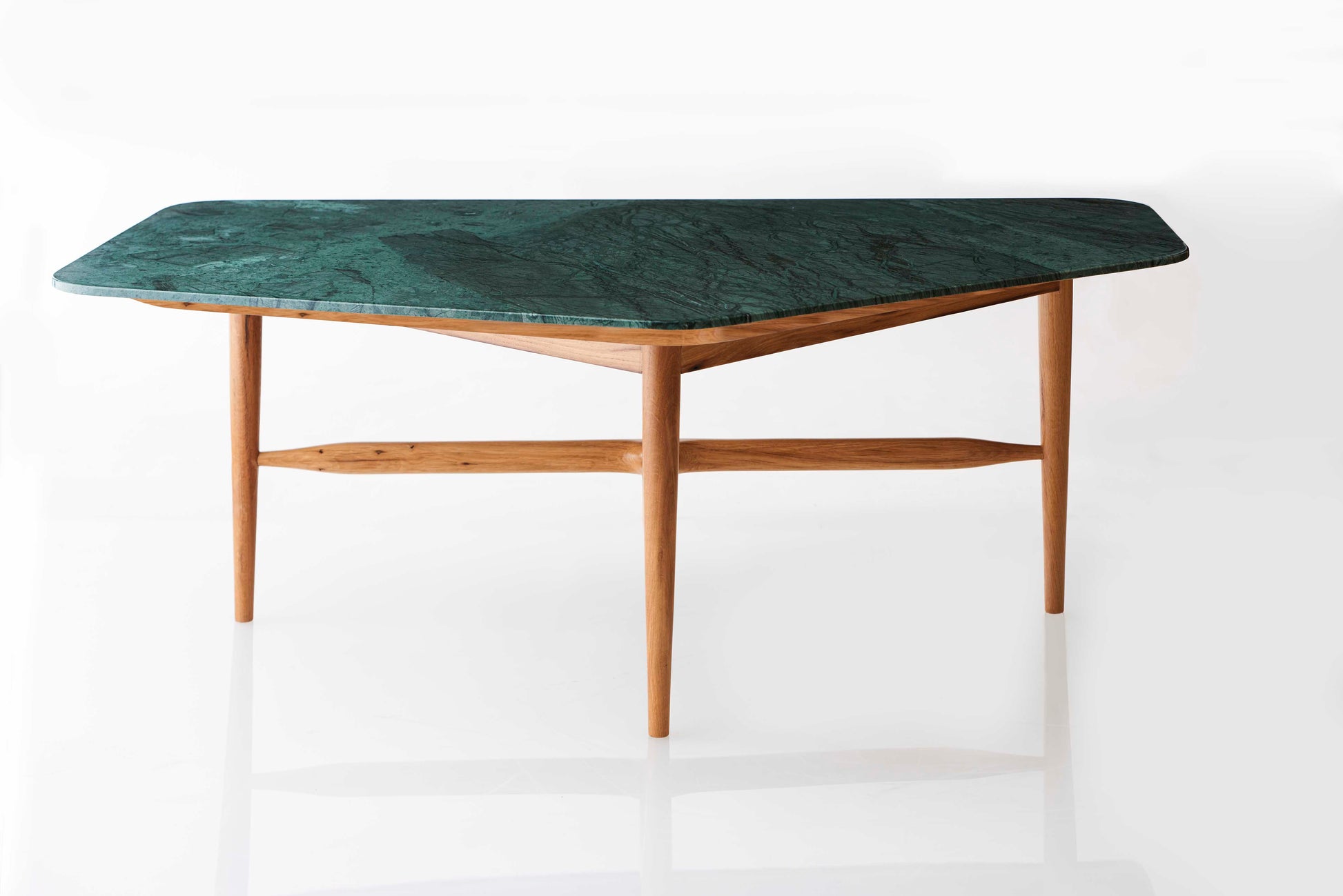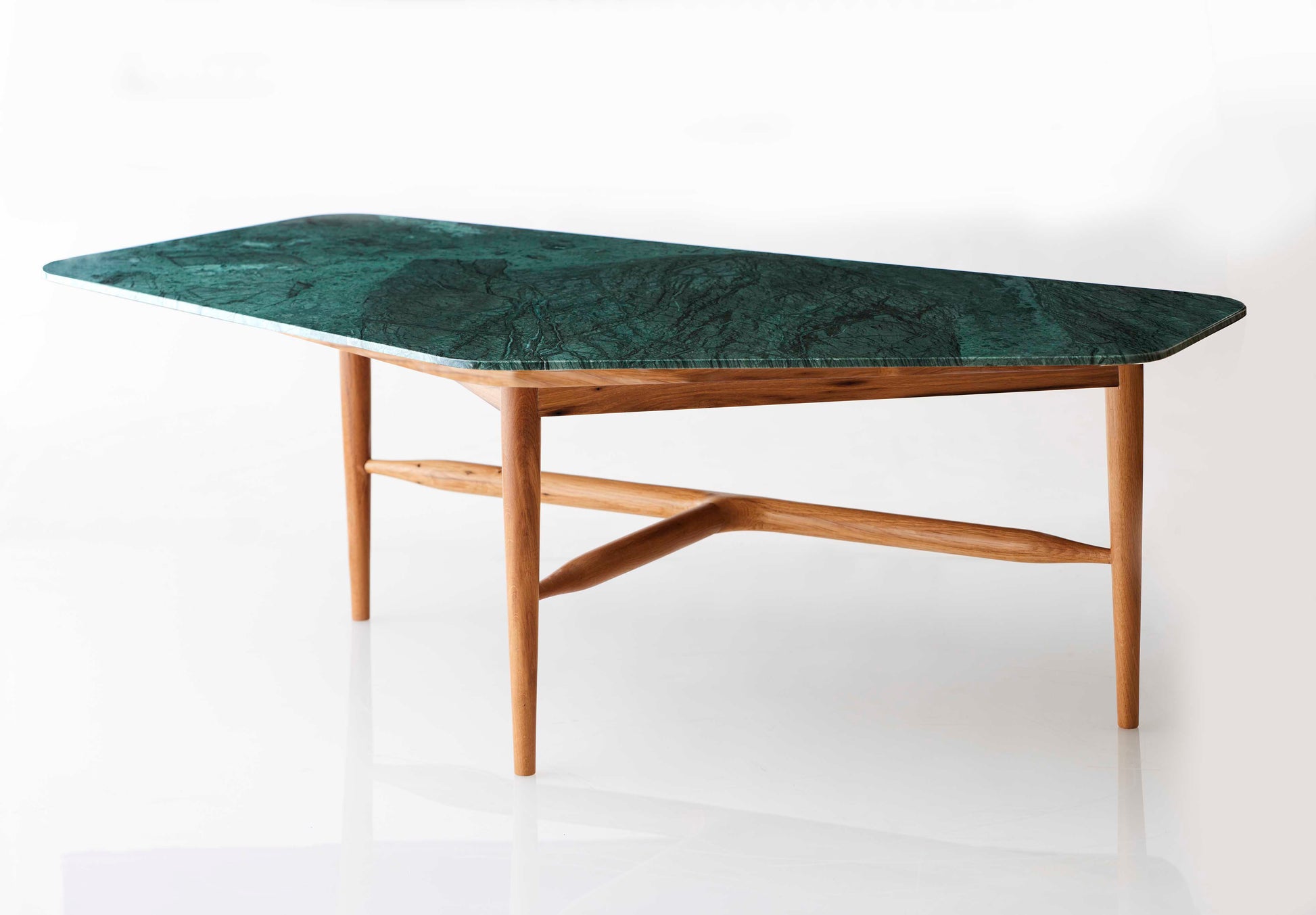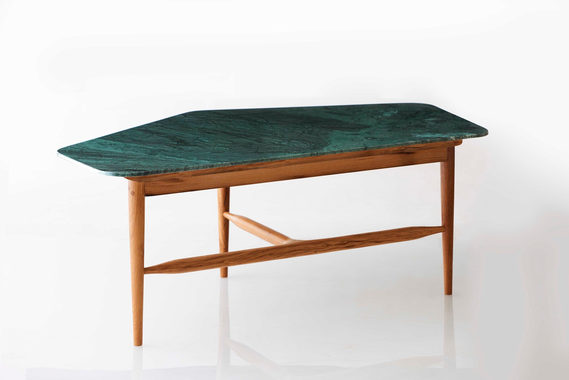 Couchtisch aus grünem Marmor und Tischbeinen aus Massivholz, naturfarben.