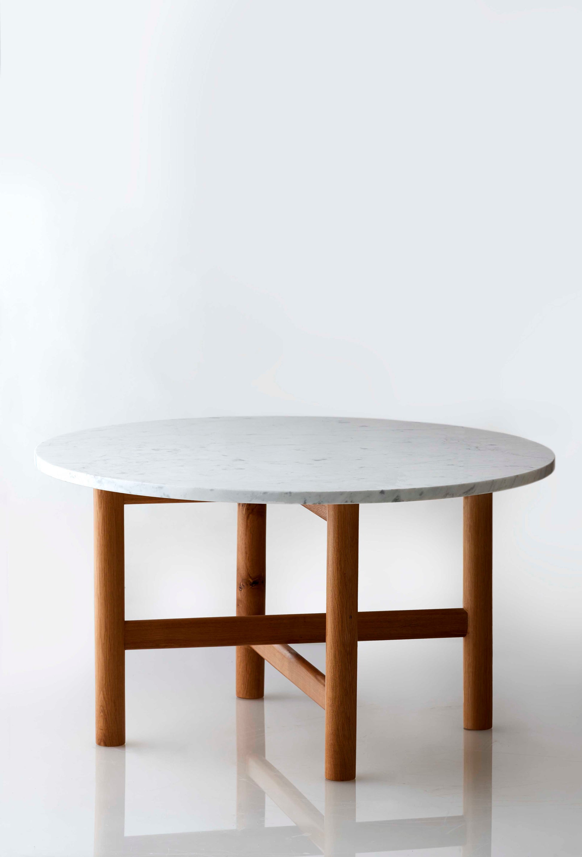 Couchtisch aus weißem Marmor mit Beinen aus Massivholz.