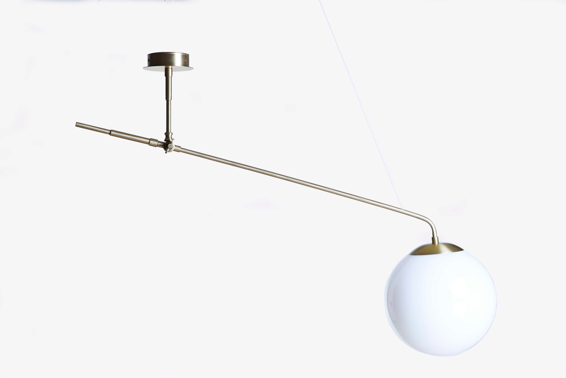 Hängeleuchte aus Messing und kugelförmigem Leuchtkörper.