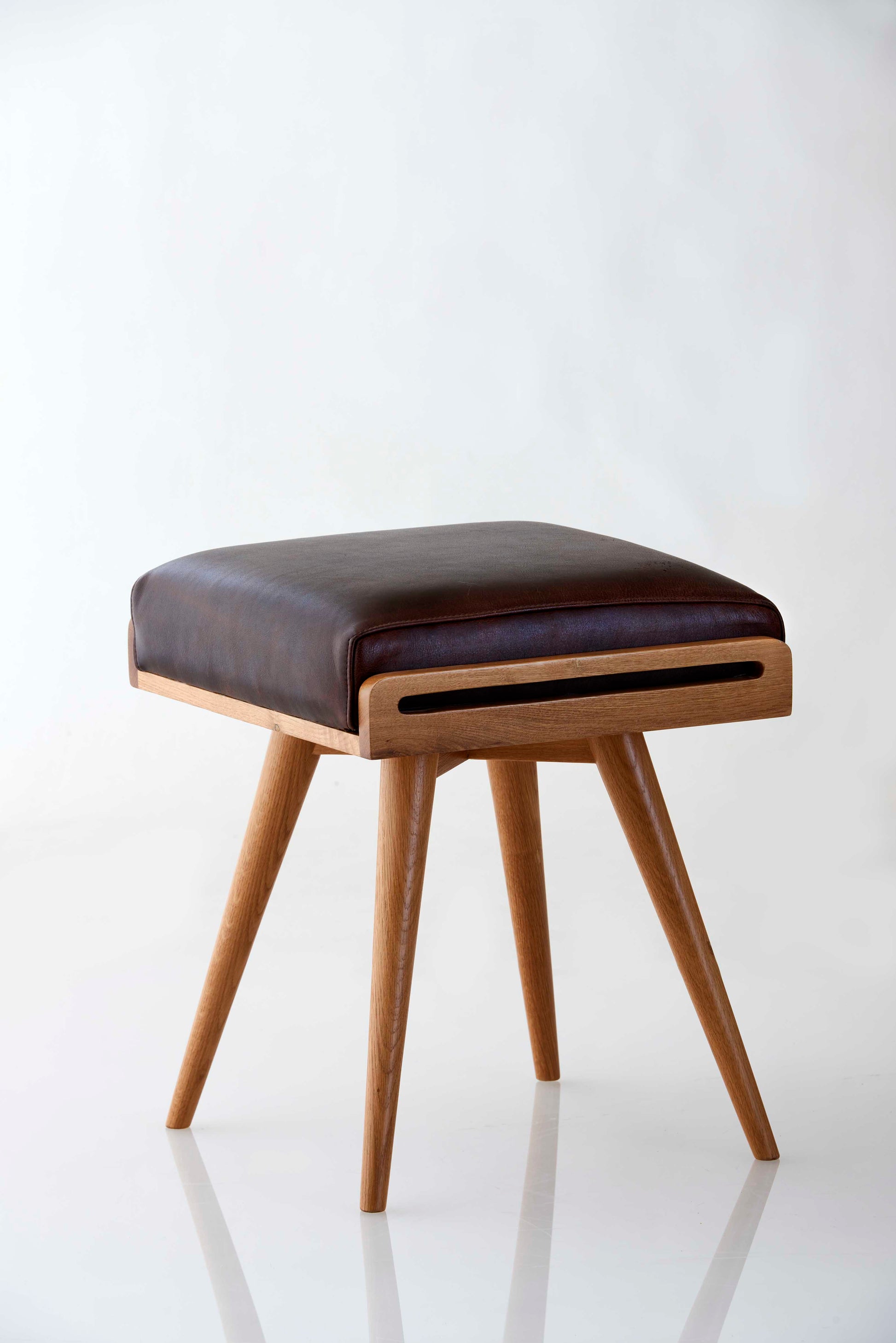 Sitzhocker aus Massivholz mit Lederpolsterkissen.