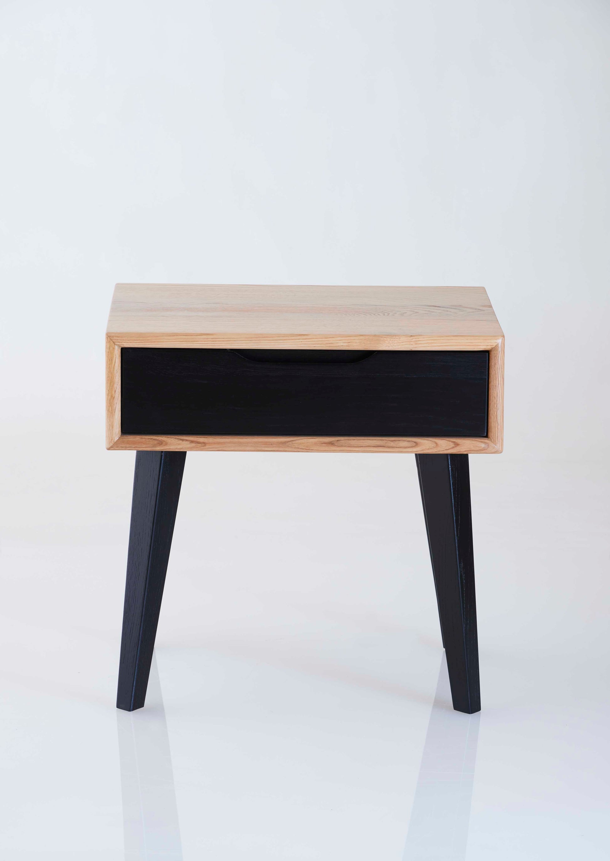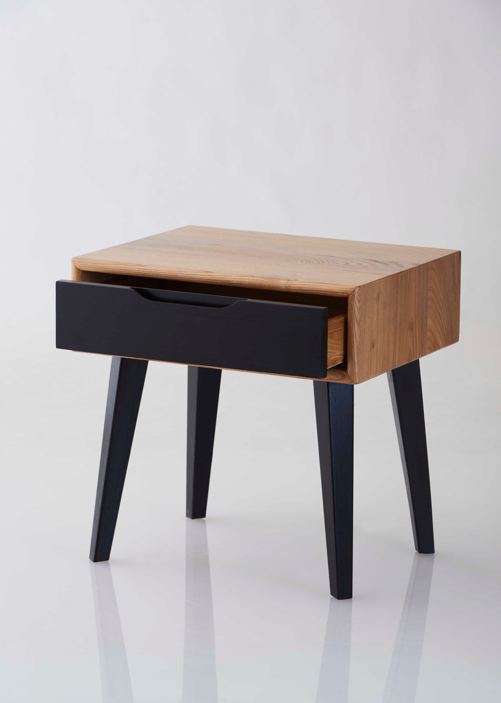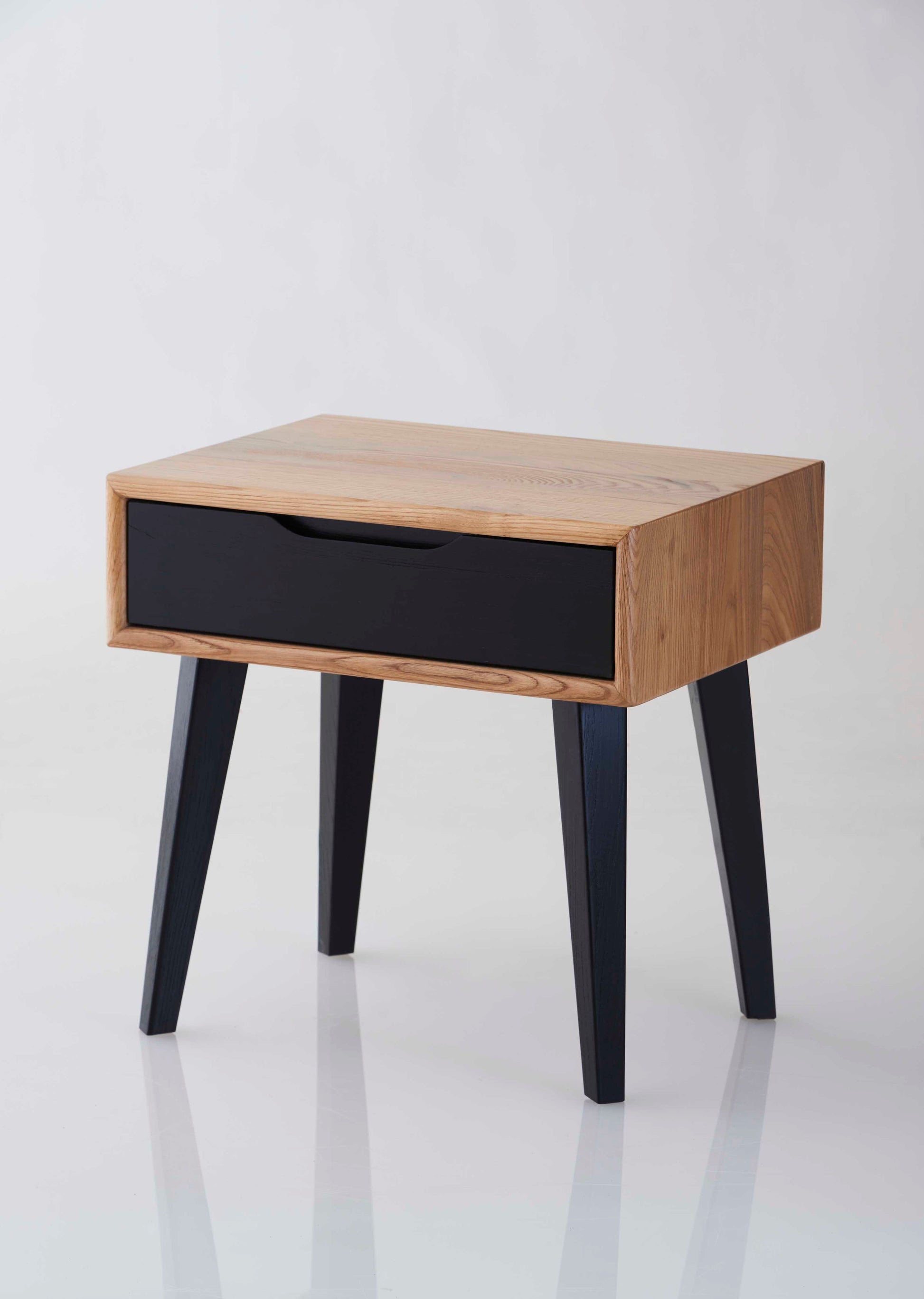 Nachtkommode mit Schublade aus Massivholz in schwarz und braun.