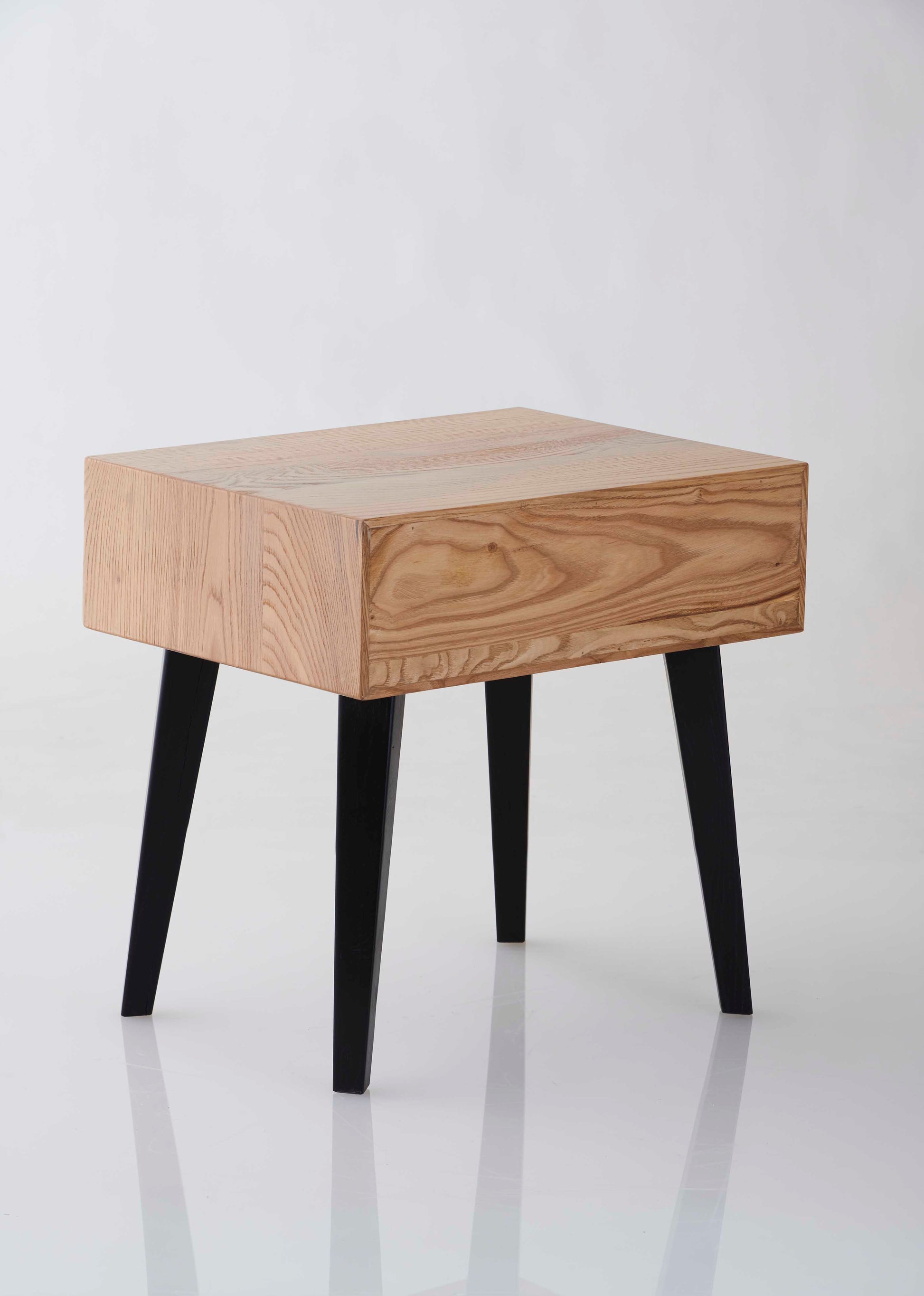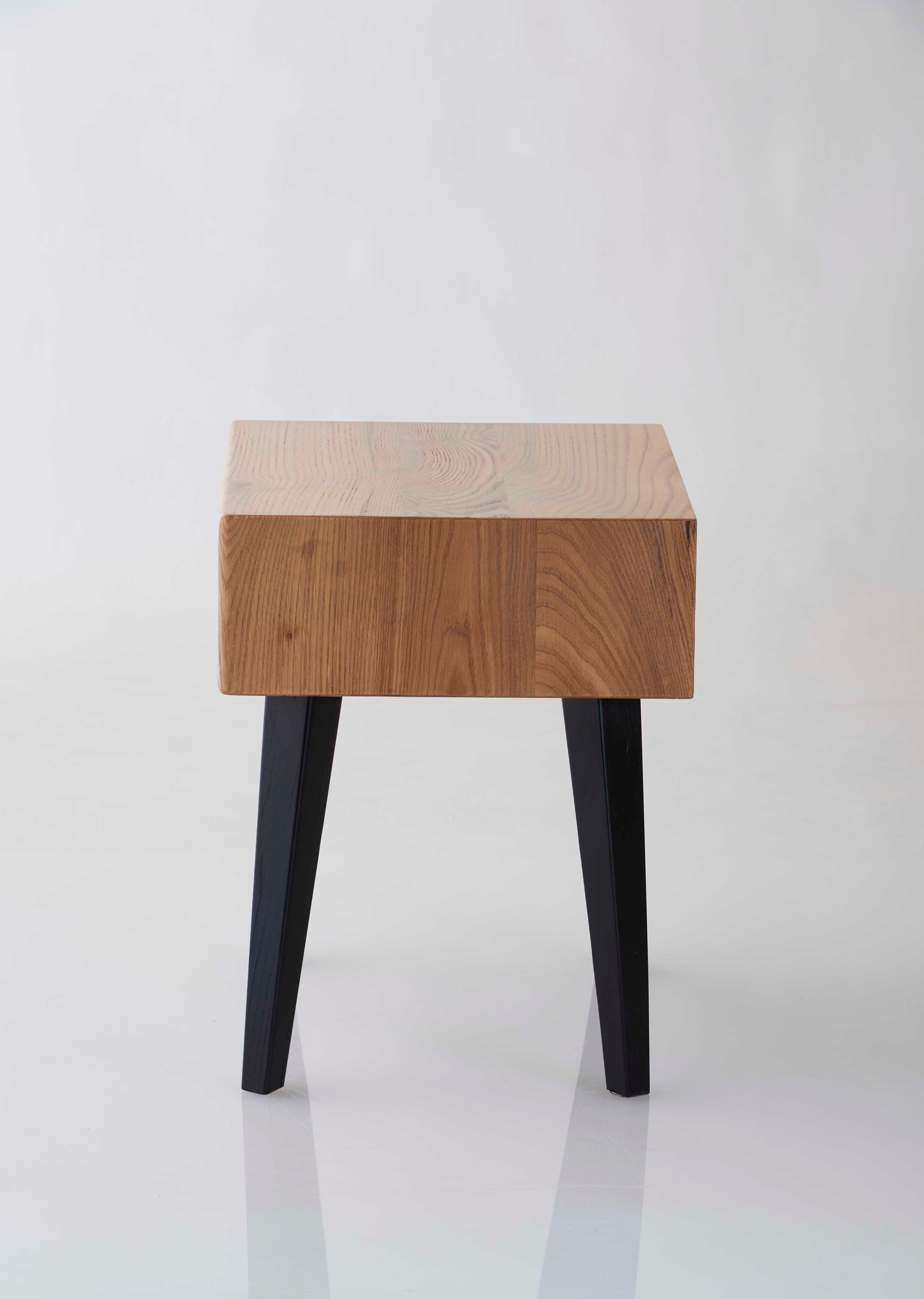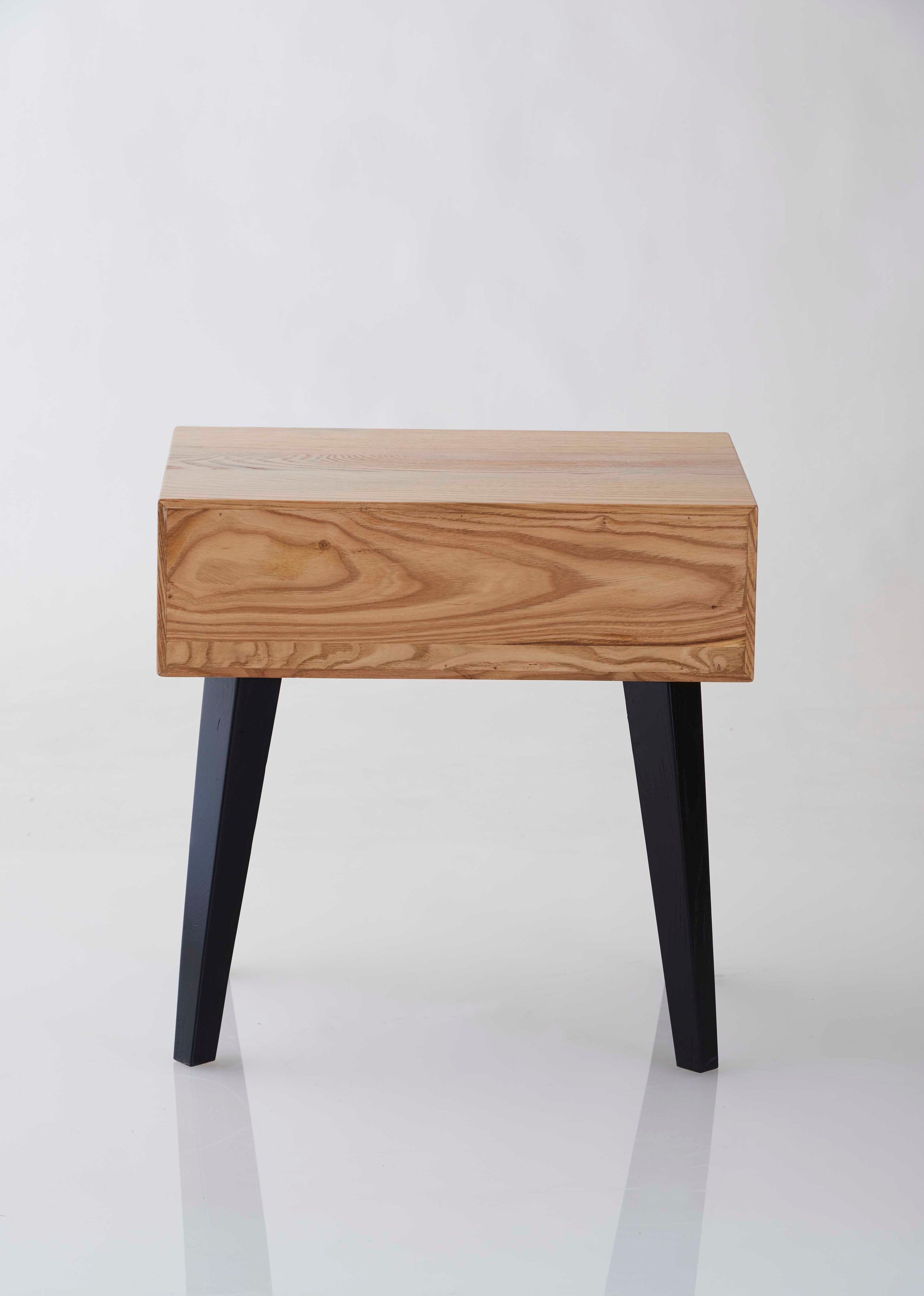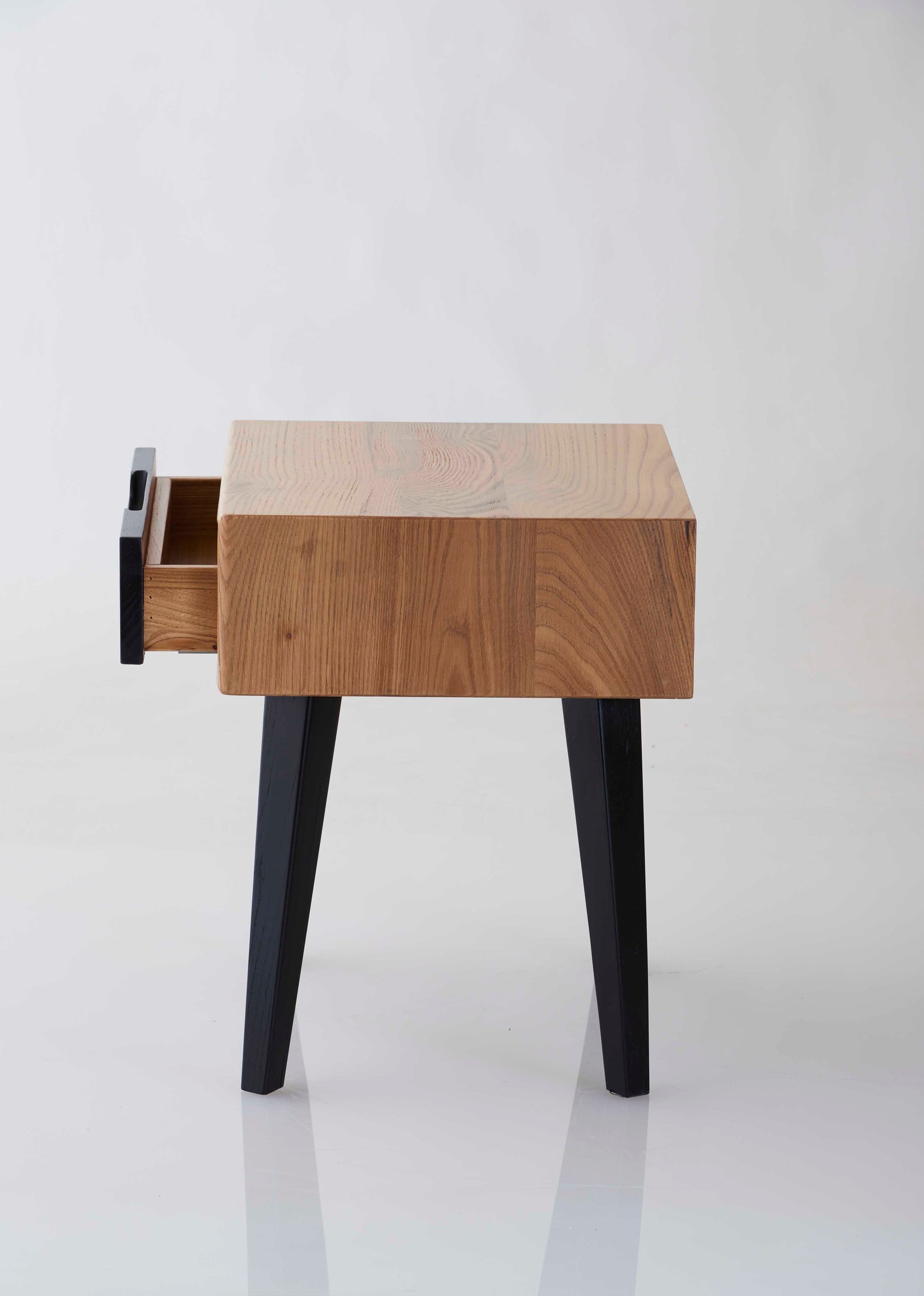 Nachtkommode mit Schublade aus Massivholz in schwarz und braun.