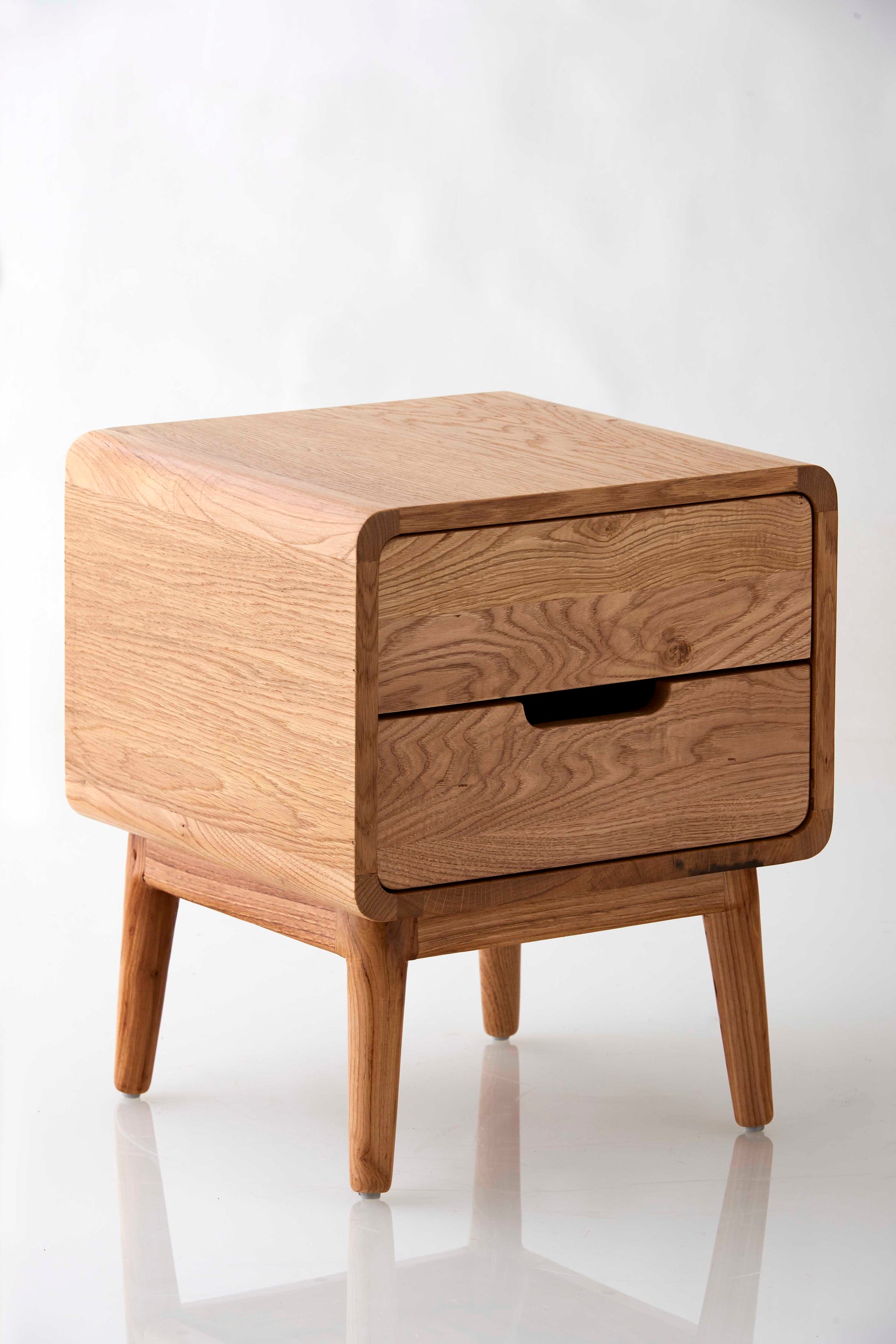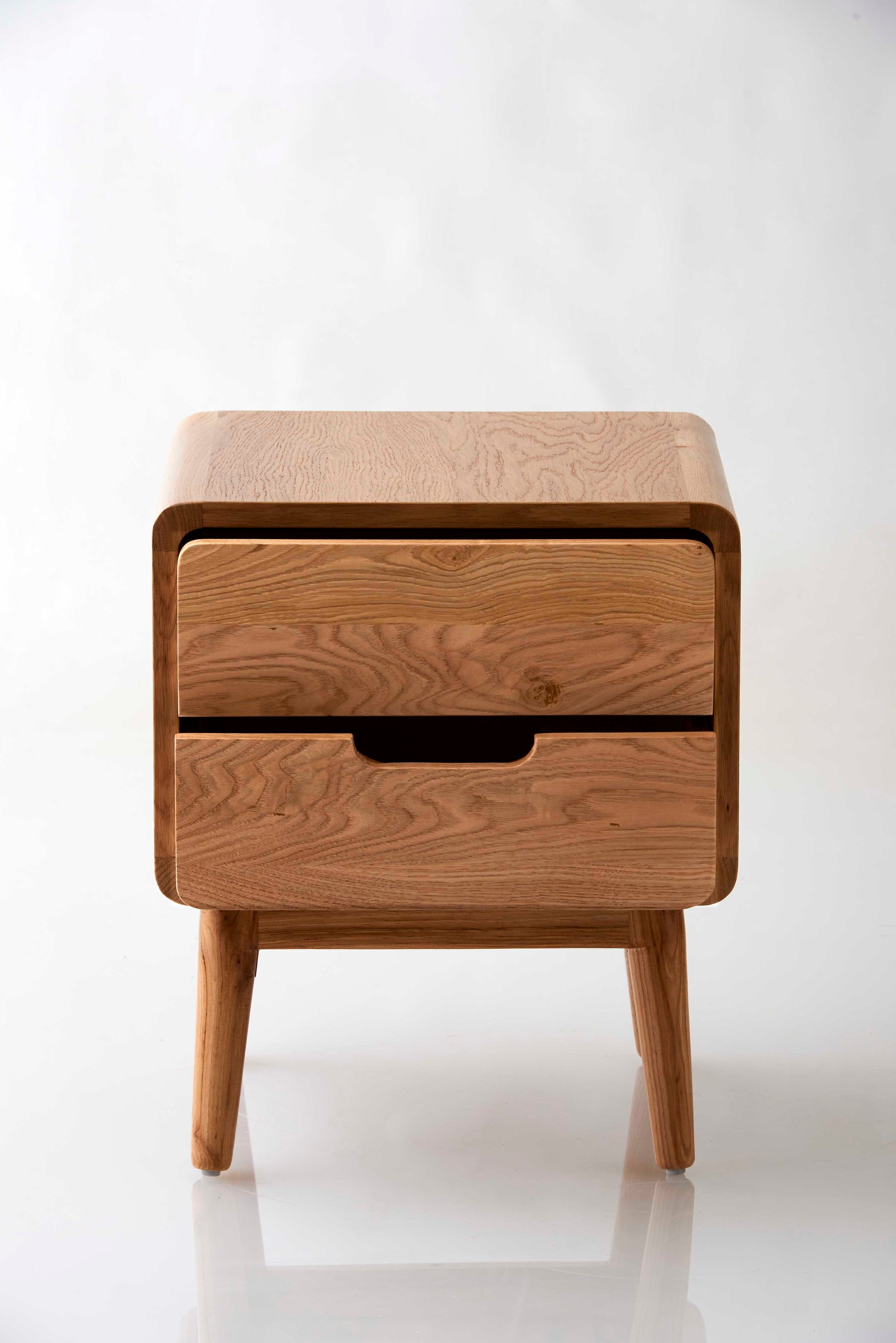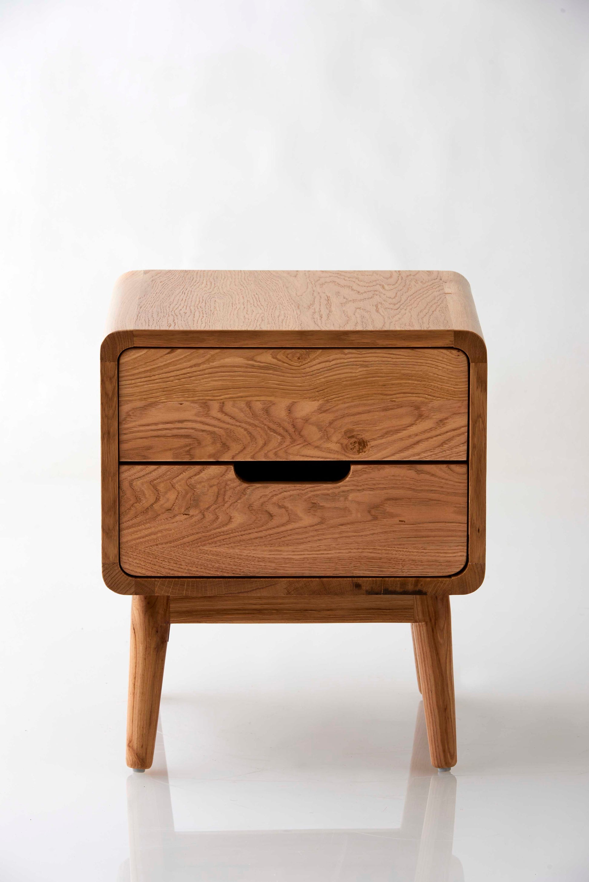 Nachtkommode aus Massivholz mit zwei Schubladen in braun.