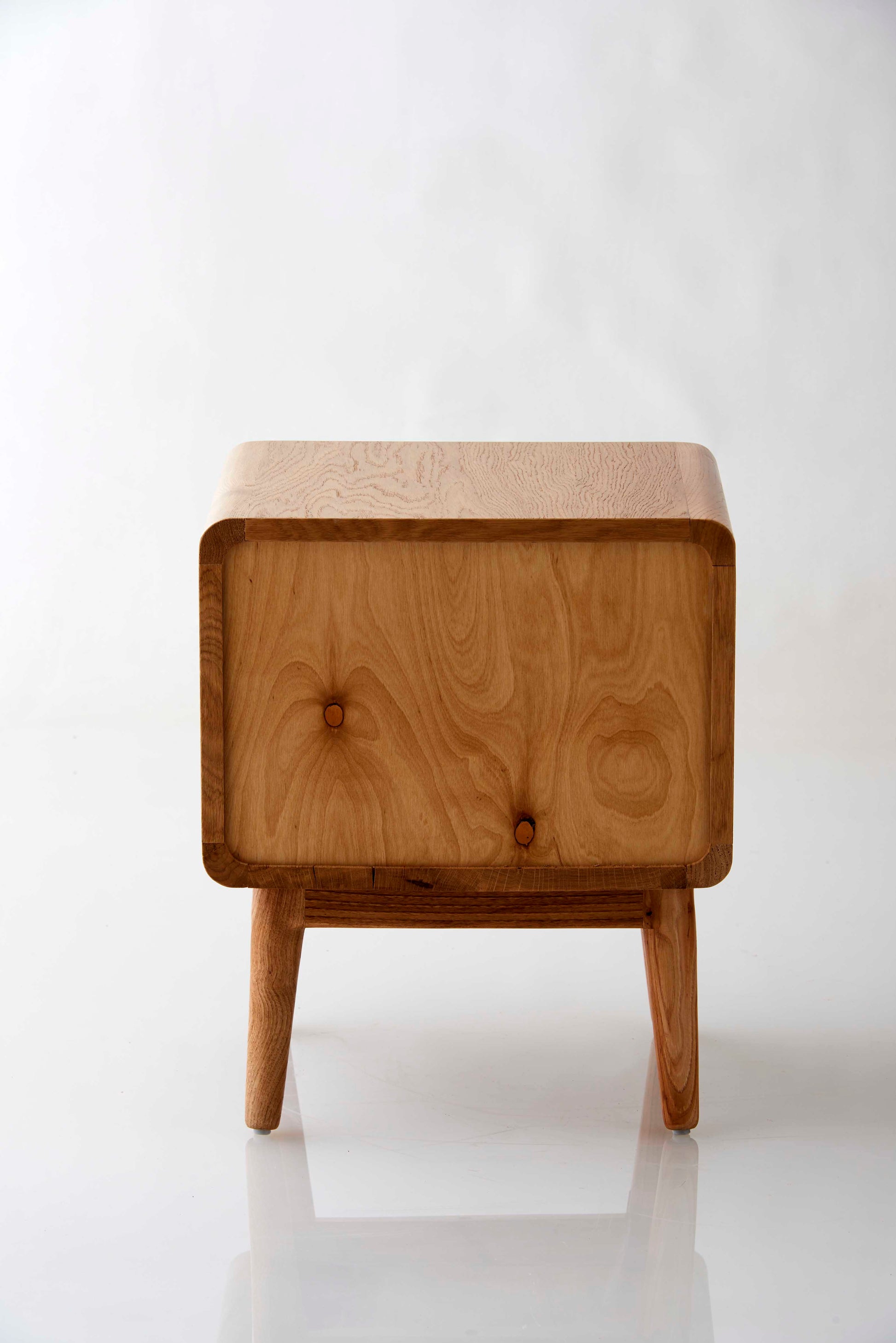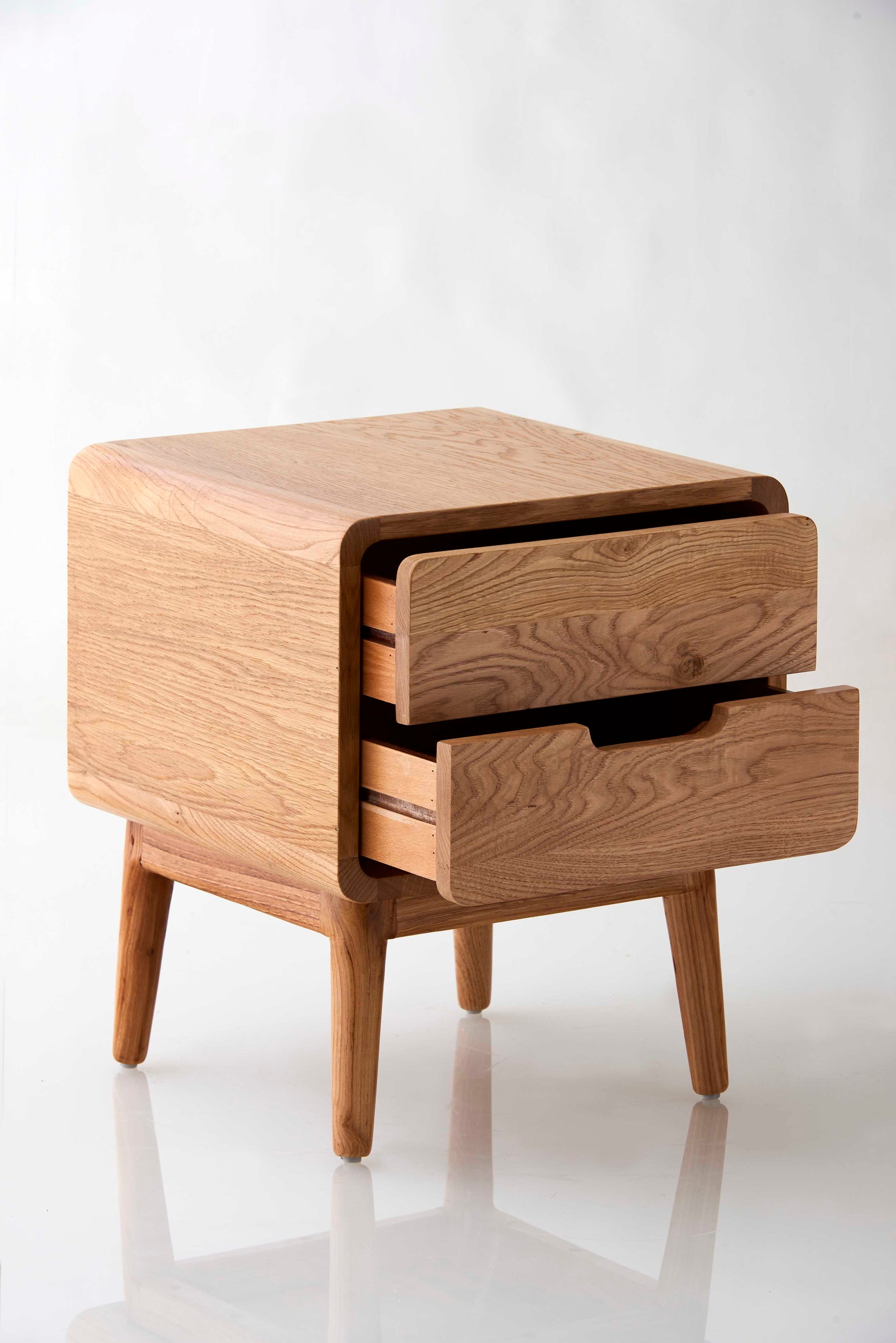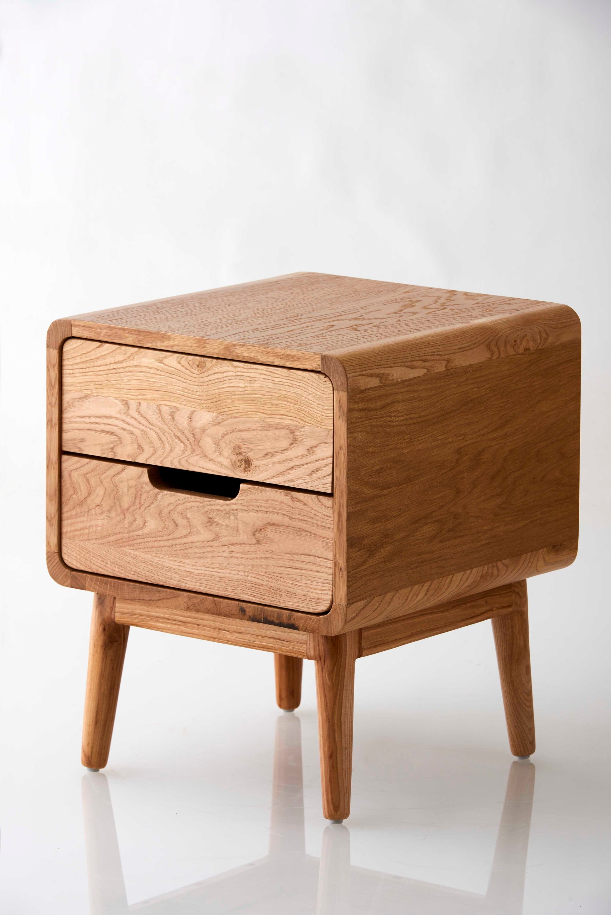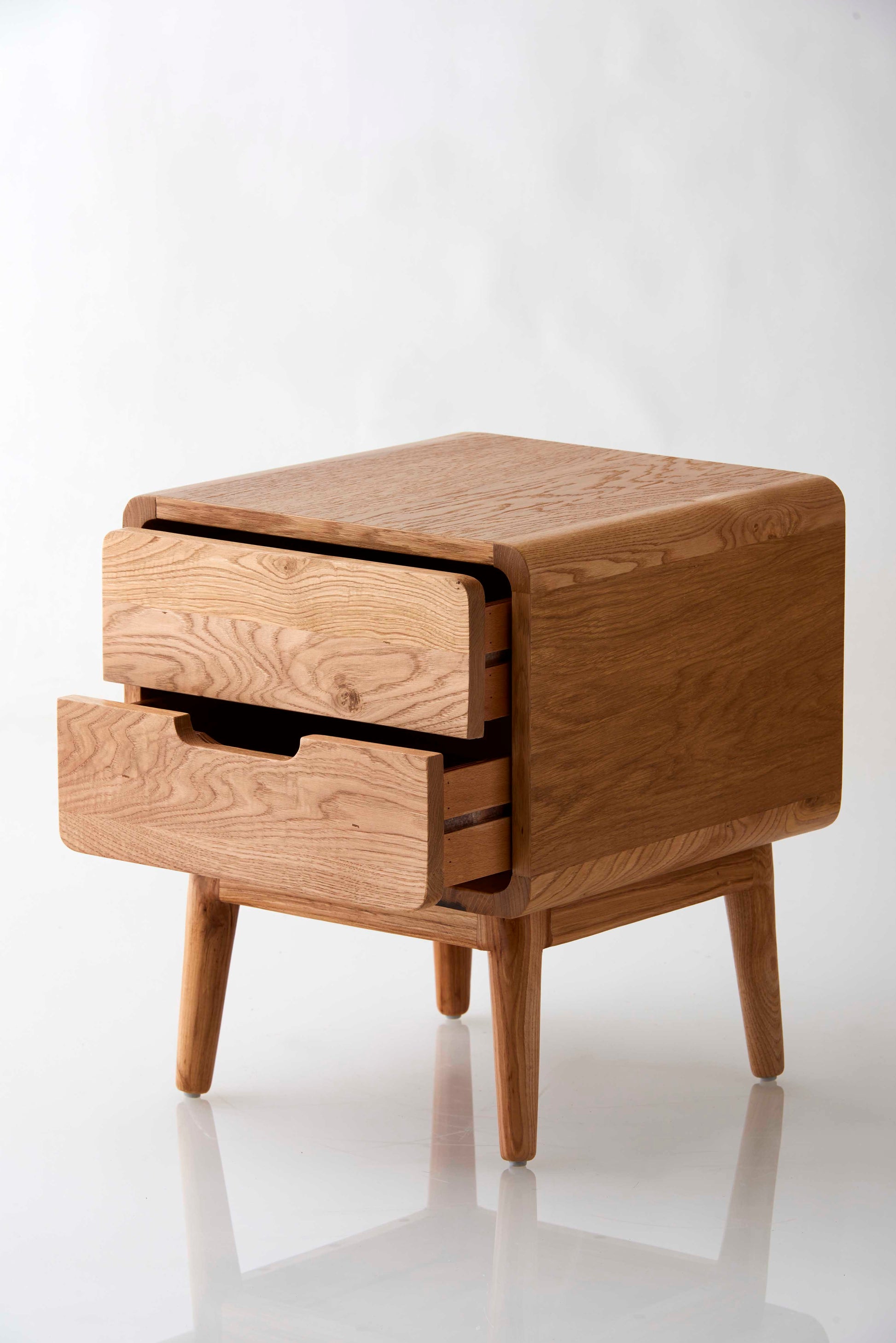 Nachtkommode aus Massivholz mit zwei Schubladen in braun.