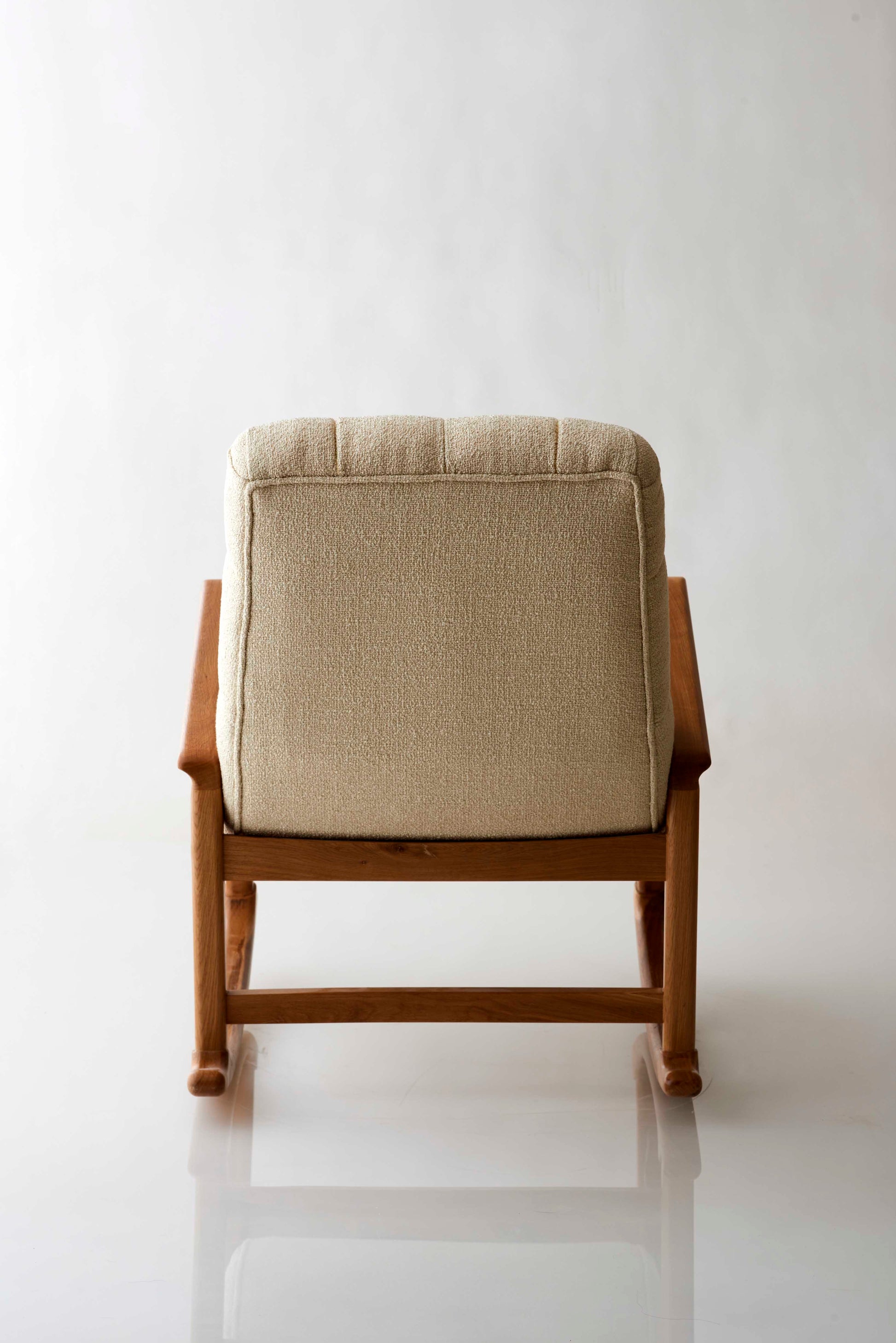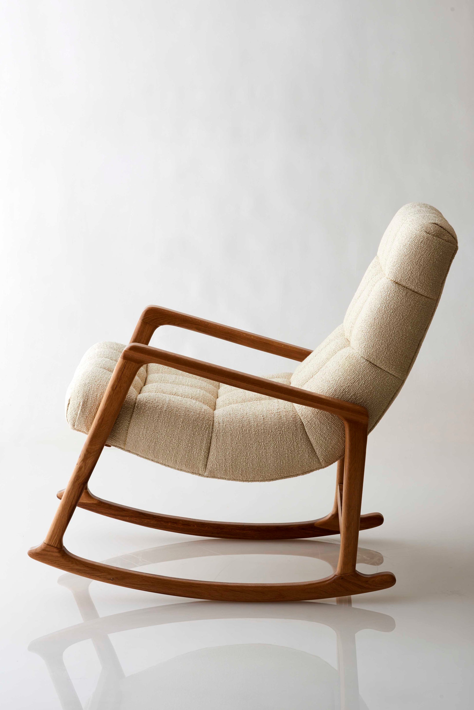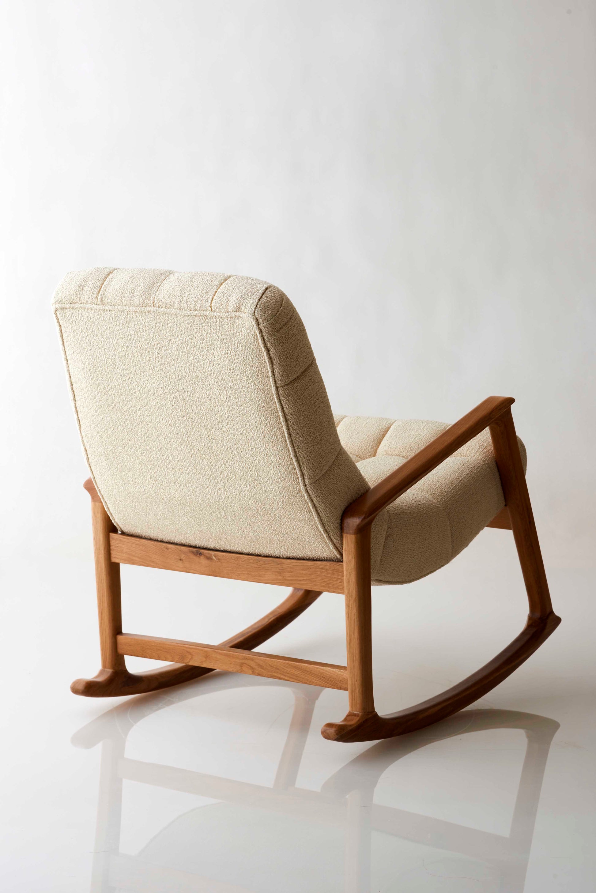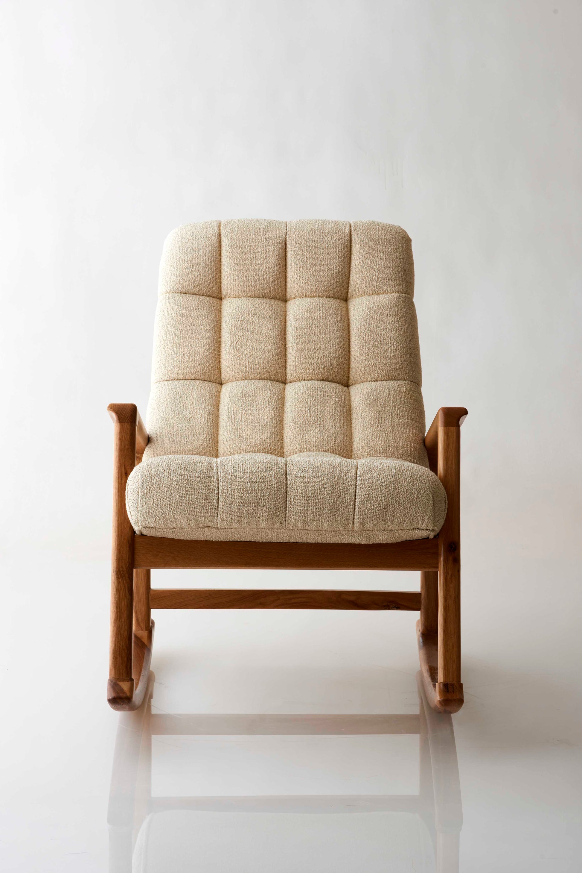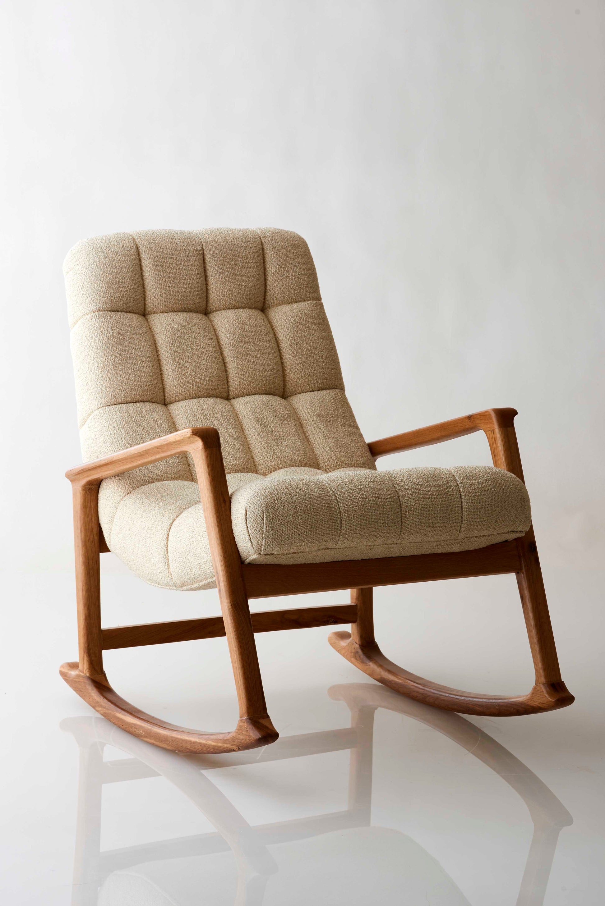 Schaukelstuhl aus massivholz und beiger Polsterung.